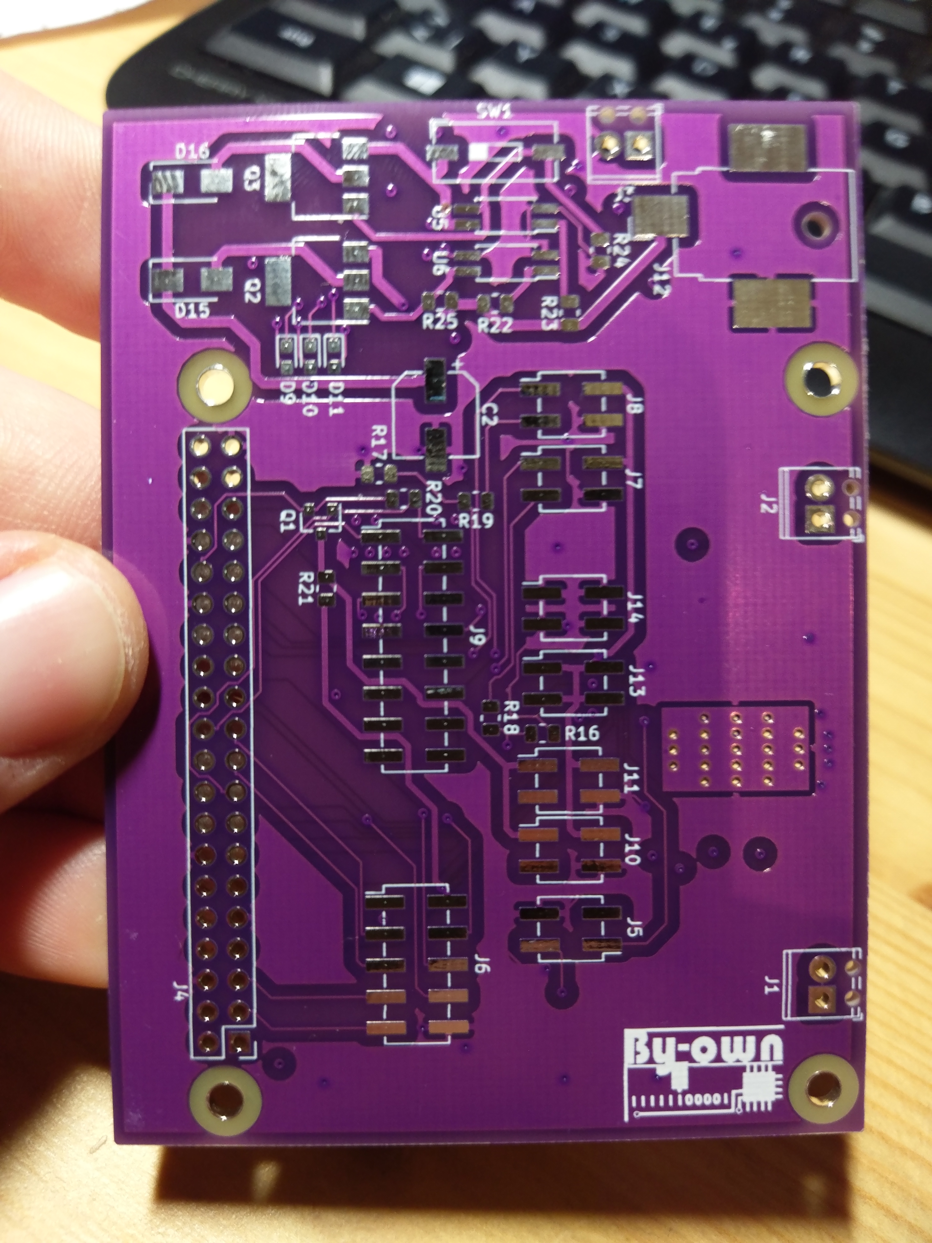 Die Farbe des Lötstopplacks wird bei der Bestellung ausgewählt. Ebenso der Bestückungsdruck, welcher das Bestücken und sofern notwendig die Fehlersuche vereinfacht. Außerdem haben wir das by-own Logo mit auf die Platine gepackt.